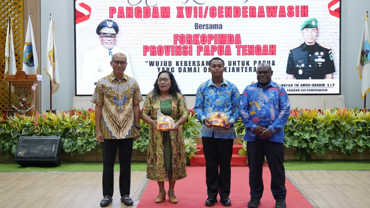 Acara kemudian dilanjutkan dengan penyerahan cenderamata dari Pangdam XVII/Cenderawasih kepada Gubernur Papua Tengah sebagai simbol penghormatan dan persahabatan antara institusi TNI dan Pemerintah Daerah.
