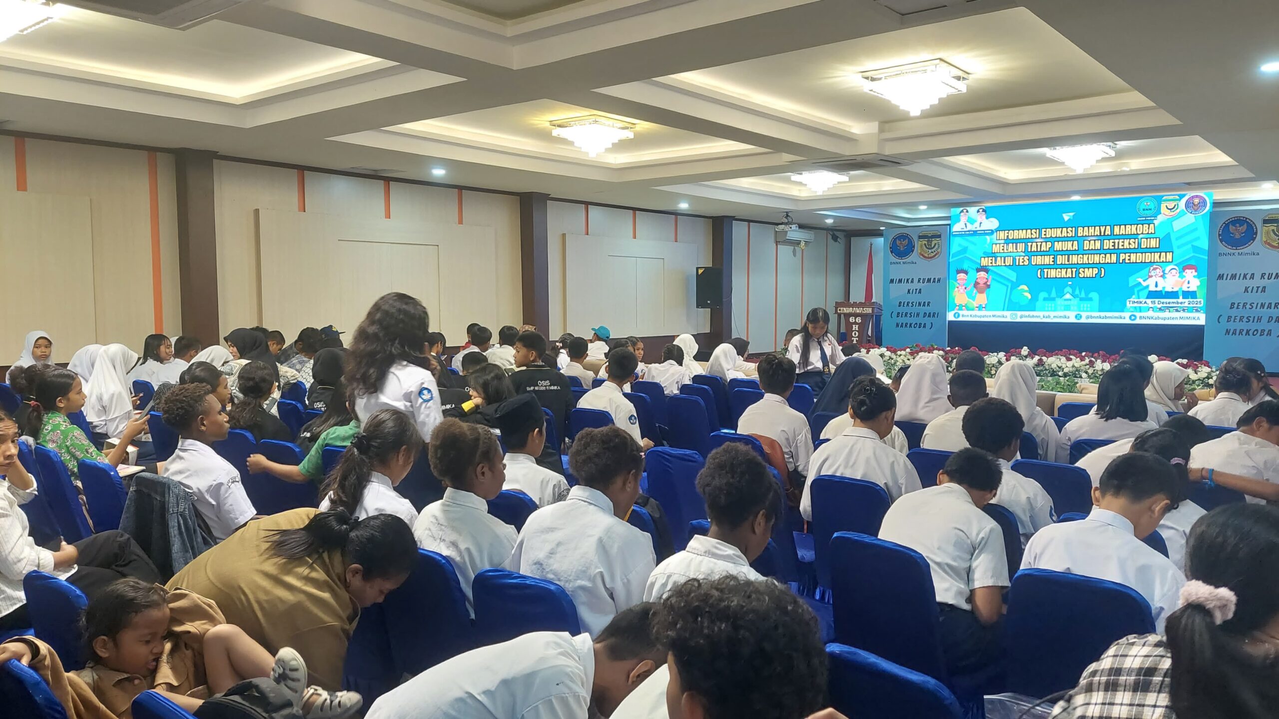Mimika ( Jurnal Timika ) – Ratusan pelajar tingkat SMP mengikuti sosialisasi bahaya narkoba dan deteksi dini atau tes urine yang digelar oleh Badan Narkotika Nasional Kabupaten (BNNK) Mimika, di ruang serbaguna salah satu hotel di Jalam Cenderawasih, Senin (15/12/2025).