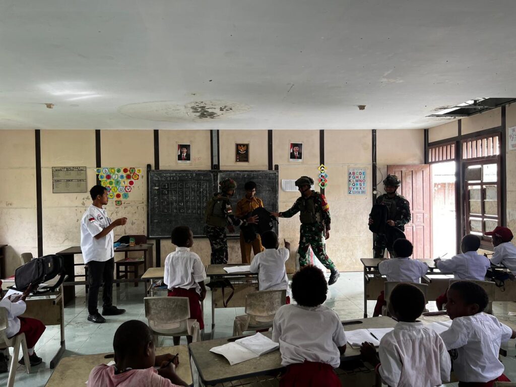 Mimika -(Jurnal Timika) Satgas Yonif 611/Awang Long berbagi peralatan penunjang sekolah kepada siswa-siswi SDN Inpres Aroanop, Rabu (5/2/2025).