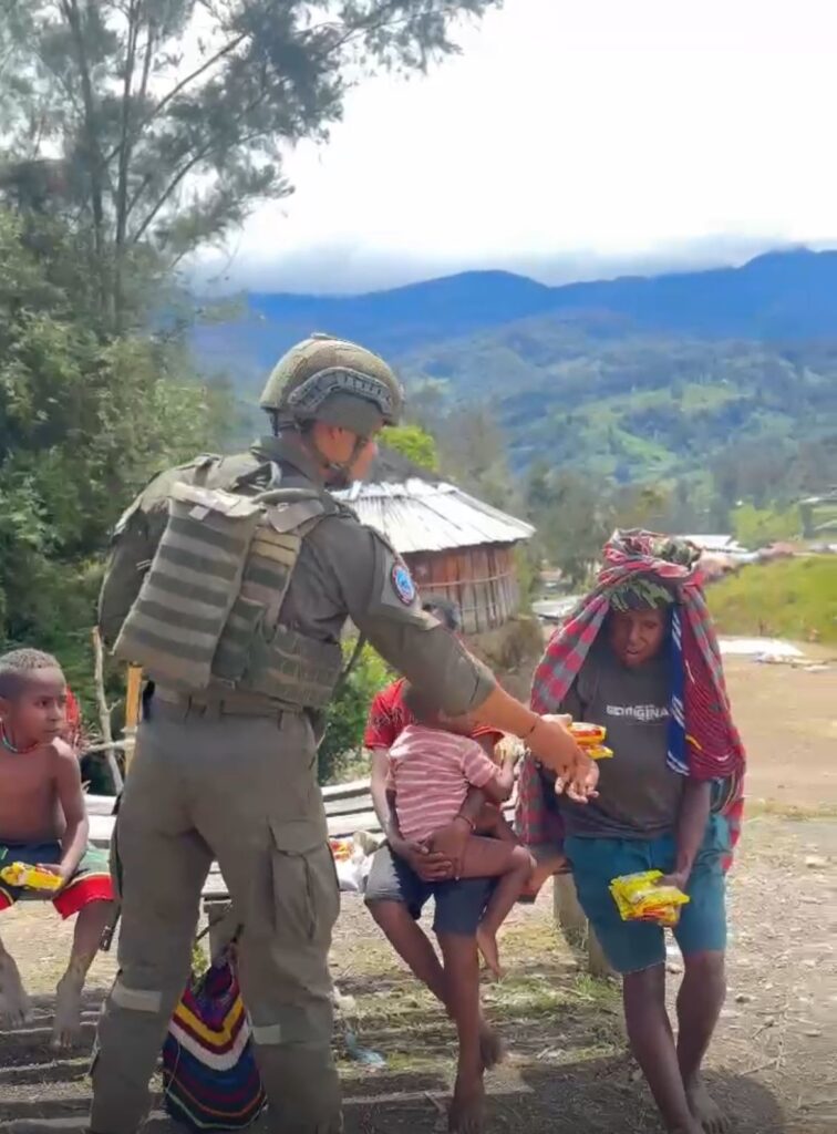 Mimika ( Jurnal Timika ) — Upaya membangun kedekatan dengan masyarakat terus dilakukan oleh Satgas Operasi Damai Cartenz-2025 melalui pendekatan humanis di wilayah penugasan. Salah satunya diwujudkan melalui kegiatan berbagi makanan ringan kepada warga sekitar.